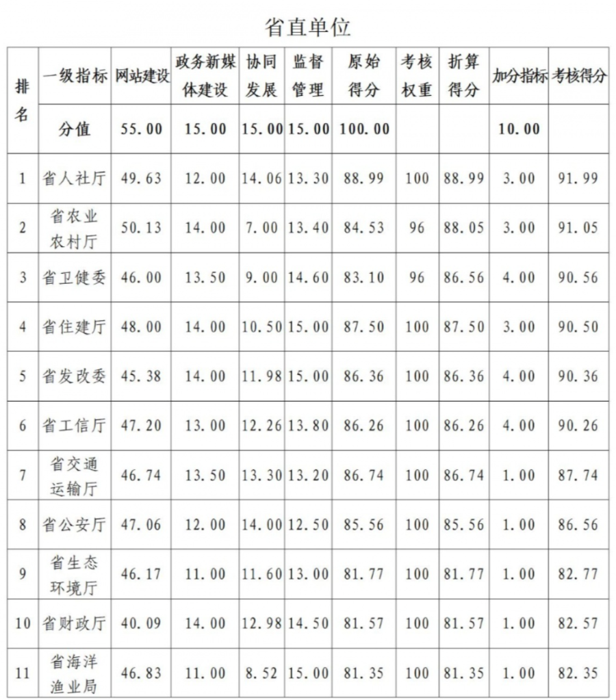 注:1.“基础信息发布-数据统计”(1分)和“重点信息公开-财政资金”指标(1分),省人防办不参加考核。 2、“数据开发”指标(4分),省民族宗教厅、审计厅、国资委和信访局不参加考核。 3.“办事服务”指标(16分),省民族宗教厅、退役军人厅、审计厅、外办、国资委和信访局不参加考核。 4.“政务新媒体建设-便民服务”指标(3分),省民族宗教厅、退役军人厅、外办、国资委和信访局不参加考核。 5.“政务新媒体建设”指标(15分),省审计厅、人防办没有开设政务新媒体,不参加考核。 6.“协同发展-在线访谈”指标(4分),省民族宗教厅、民政厅、自然资源厅、农业农村厅、卫健委、退役军人厅、审计厅、国资委、广电局、体育局、人防办、医保局、金融监管局、信访局不参加考核。 7.“加分指标”,根据各部门向省政府办公厅报送优秀创新案例材料以及上述材料被权威第三方绩效评估机构采纳情况、网站适老化改造情况、落实省委省政府关于政府网站与政务新媒体建设要求情况,综合评定。 注:“加分指标”,根据网站适老化改造情况评定。 ![]() |