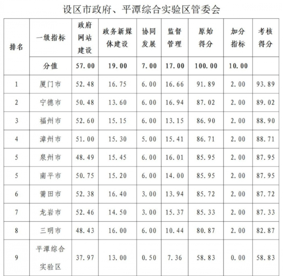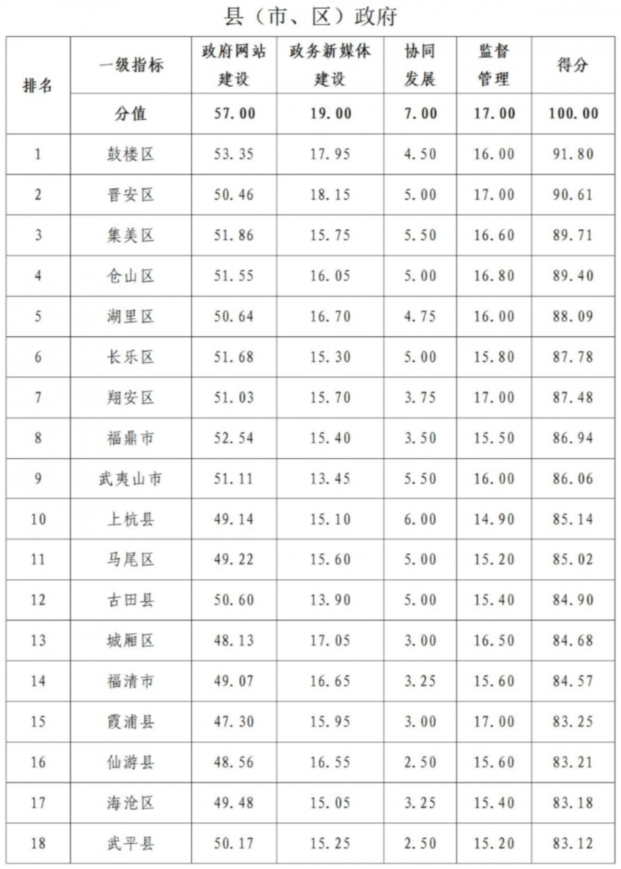 各市、县(区)人民政府,平潭综合实验区管委会,省人民政府各部门、各直属机构: 为进一步建好、管好、用好政府网站与政务新媒体,根据《关于开展2021年度全省政府网站与政务新媒体绩效考核的通知》(闽政办函〔2021〕57号),省政府办公厅组织开展了2021年度全省政府网站与政务新媒体绩效考核。现将情况通报如下: 一、总体情况 完成34个省直单位,9个设区市、平潭综合实验区和82个县(市、区)共计126个政府网站日常监测和年度综合考核,以及304个政务新媒体年底抽查的数据采集、审核和汇总分析等工作。 (一)省直部门政府网站与政务新媒体。平均得分为77.72分,较2020年提高2.16分,整体绩效水平有所提升。省人社厅、农业农村厅、卫健委、住建厅、发改委、工信厅、交通运输厅、公安厅、生态环境厅和财政厅等单位绩效水平为优秀。省卫健委、信访局、生态环境厅、金融监管局和医保局等单位绩效水平提升较快。 (二)设区市政府和平潭综合实验区管委会门户网站与政务新媒体。平均得分为85.32分,较2020年上升了1.56分,整体绩效水平有所提升。厦门市、宁德市和福州市绩效水平为优秀。泉州市绩效水平提升较快。 (三)县(市、区)政府门户网站与政务新媒体。平均得分为77.15分,较2020年上升了1.38分,整体绩效水平有所提升。鼓楼区、晋安区、集美区、仓山区、湖里区、长乐区、翔安区、福鼎市、武夷山市和上杭县绩效水平为优秀。长汀县、闽侯县、沙县区、南安市、洛江区、仙游县、霞浦县、泉港区、芗城区和长泰区等县(市、区)绩效水平提升较快。 二、主要亮点 (一)不断优化提升政府网站建设。省委省政府主要领导高度重视政务网站整合优化工作,多次专题研究作出部署。省政府办公厅印发《省政府门户网站问题清单及整改方案》,不断健全完善标准化建设、标准化管理、标准化考核工作机制。全省各级各部门坚持问题导向,积极对标对表查找不足,按照“任务项目化、项目清单化、清单具体化”的要求,细化分解任务,按时完成整改任务,不断提升工作实效。 (二)促进政务新媒体健康有序发展。依托全国政务新媒体信息报送系统和全省政务新媒体监管平台,建立了全面准确、动态更新的基本信息库,实现对全省超过2900个政务新媒体统一登记备案、内容监测、矩阵管理、分析统计和考核评估。各级各部门强化政务新媒体开办、下线、注销等管理机制,对群众反映强烈的“僵尸”“空壳”等“指尖上的形式主义”问题有序开展排查整治,进一步推动政务新媒体健康有序发展。 (三)推动政务服务高效便民。加快省政府门户网站和省网上办事大厅深度融合,推动数据、服务、应用融通,推进政策信息“一网通查”、办事服务“一网通办”、互动交流“一网通答”、数据资源“一网通管”。我省政务服务事项全程网办比例80.4%,“一趟不用跑”比例90.3%。闽政通APP注册用户超过5500万人,月活跃用户超过2200万,累计整合全省便民服务事项25类超1300项,成为国内用户活跃度、便民应用使用率都排行靠前的省级移动政务服务平台。 (四)不断提高政策解读实效。省直有关部门按照关于加强政策解读有关要求,在起草政策文件时,同步报送解读方案,在发布政策文件时,同步发布政策解读。2021年3月份以来,省级政策性文件解读率达到100%。全省政府网站普遍采用图表图解、音频、视频、动漫等形式多样化解读政策文件,实现解读材料与政策文件双向互相关联,提升可读性和传播性,回应公众关切。省直有关部门主要领导积极参加“厅说福建”,莅临福建电视台演播厅接受访谈,用群众语言解读省委省政府最新政策,架好党委政府和群众的“连心桥”。2021年7月5日,推出《全媒体直播2021高考志愿填报指南》,采用实时直播方式为广大考生和家长解读新高招政策,当天全网触达人群超3000多万,全网播放量达1200多万。 (五)助力统筹疫情防控和经济社会发展。省、市、县三级政府门户网站普遍建立疫情防控专题专栏,或链接省政府门户网站疫情防控专栏。全省政府网站与政务新媒体矩阵协同联动,统一发声,发布疫情防控权威信息。一些部门积极推动更多利企便民服务事项向政府网站和政务新媒体延伸,不断提升网上政务服务水平,让“不见面审批”“无接触服务”等创新工作方式助力打赢疫情防控歼灭战。省政府门户网站开通“新冠肺炎疫情防控诉求与建议通道”,省工信厅“党政新时空·政企直通车”开通“助企抗疫绿色通道”,解决群众出行、物资、就医等生活困难,帮助企业协调物流交通、生产原材料供应、临时性资金周转等生产运行困难,共办理群众和企业涉疫诉求建议事项2.6万件,平均办理时长16.51小时,有效帮助企业和群众解决“急难愁盼”问题。 三、存在的不足 (一)政府网站方面。部分政府网站、政务新媒体日常巡查监测不严,存在页面链接不可用、外链错误或打不开等问题。部门网站二三级链接IPv6访问支持率还不满足国务院办公厅有关工作要求。部分部门和地区没有按季度开展政府网站与政务新媒体自查工作。信息发布审核机制有待进一步完善与落实,部分政府网站信息存在内容错误、表述不规范等现象。部分政府网站信息更新不及时,重点领域信息公开质量有待提升。部分政府网站政策解读内容与政策文件内容差别不大,解读深度和实用性有